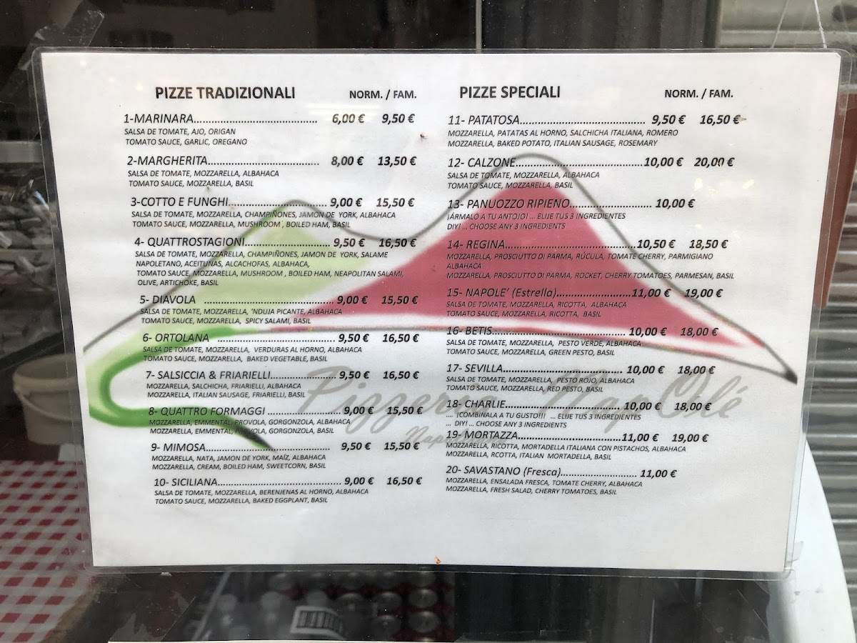 - Pizza Sevilla: A flavorful take with red pesto, mozzarella, and basil, priced at €13.90.